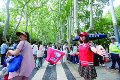 《钟山风景名胜区交通优化提升措施的通告》实施后的首个长假,包括中山陵园管理局机关干部、大学生志愿者等组成的博爱钟山志愿团队“上岗”,共计400多人分布在主要景点、出入口、观光车站等区域,协助开展预约购票、扫码检录、秩序维护、文物巡查等工作,为游客“保驾护航”。